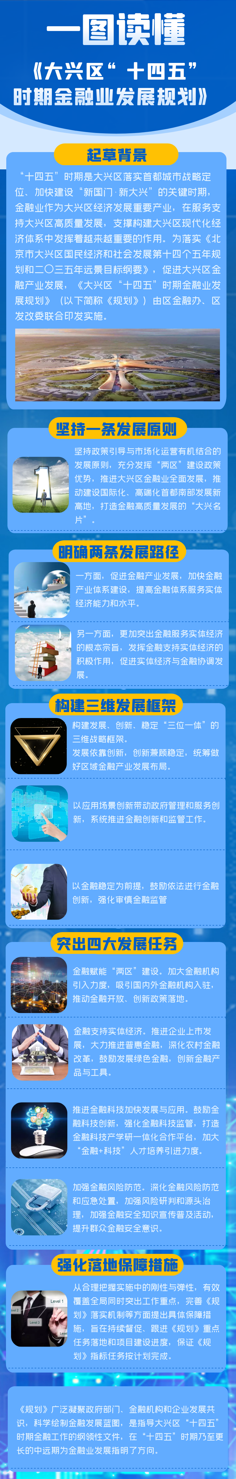 《大兴区“十四五”时期金融业发展规划》(以下简称《规划》)是大兴区“十四五”规划体系中的专项规划,是《365bat国民经济和社会发展第十四个五年规划和二〇三五年远景目标纲要》在金融领域的延伸。《规划》明确了“十四五”时期大兴区金融业发展的指导思想、发展目标和主要任务。“十四五”时期,大兴区金融业将立足新发展阶段,完整、准确、全面贯彻新发展理念,更加自觉融入新发展格局,主动适应并积极引领金融格局深刻调整,更加突出金融服务实体经济的根本宗旨,有效维护金融安全,努力发展现代金融业。《规划》由大兴区金融服务办公室组织编制,编制工作历经工作机制确立、前期课题研究、深入区内部门、属地、园区、金融机构、重点企业和外省市特色地区开展深度走访调研,多次征求意见等阶段,广泛凝聚政府部门、金融机构和企业发展共识,科学绘制金融发展蓝图,是指导大兴区“十四五”时期金融工作的纲领性文件,在“十四五”时期乃至更长的中远期为金融业发展指明了方向。