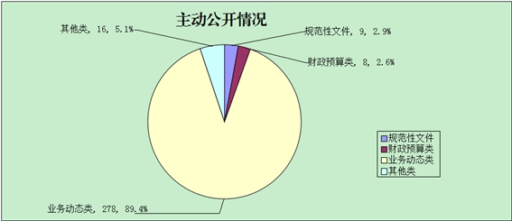 2017年主动公开政府信息数311条。其中,规范性文件信息9条,占总数的2.9%;财政预算类信息8条,占总数的2.6%;业务动态类信息278条,占总数的89.4%,其他类信息16条,占总数的5.1%。