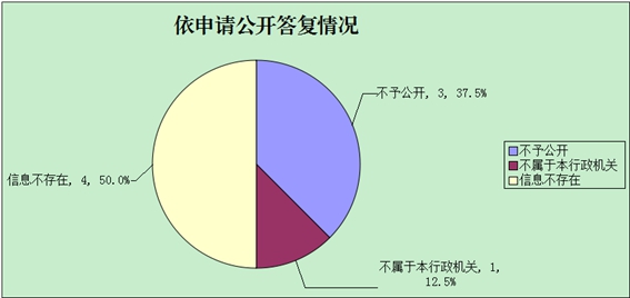 涉及个人隐私不予公开的3件,占总数的37.5%;不属于本行政机关公开的1件,占总数的12.5%,申请信息不存在的4件,占总数的50%。