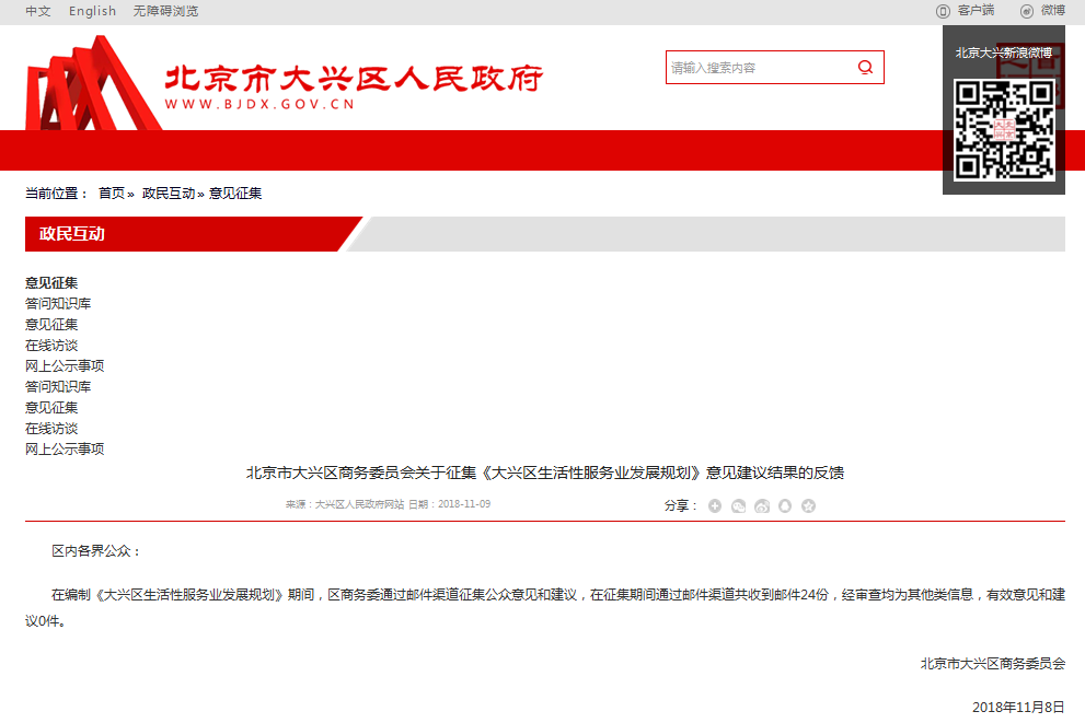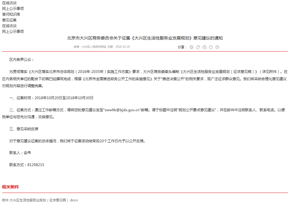 为加强工作指导性,我委编制了《大兴区生活性服务业发展规划》,并通过区政府网站公开征集了公众意见,共收到邮件24份,经审查均为其他类信息,有效意见和建议0件,及时在政府网站进行了征集结果的公开。