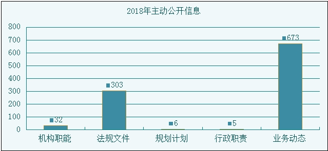 2018年我街道主动公开政府信息数1019条。其中,机构职能类信息32条,占总数的3.1%;法规文件类信息303条,占总数的29.7%;规划计划类信息6条,占总数的0.6%;行政职责类信息5条,占总数的0.5%;业务动态类信息673条,占总数的66%。